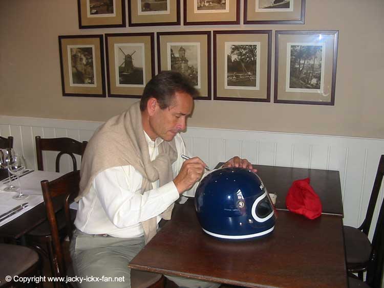 Quelques jours plus tard, Jacky Ickx me téléphonait et je lui racontais l’histoire. Il la trouva très belle et il dit : « Et bien, nous allons faire, de cette réplique, un original car je vais signer ce casque ! ». Rendez-vous fut alors pris pour le 9 septembre pour un déjeuner dans notre restaurant habituel.