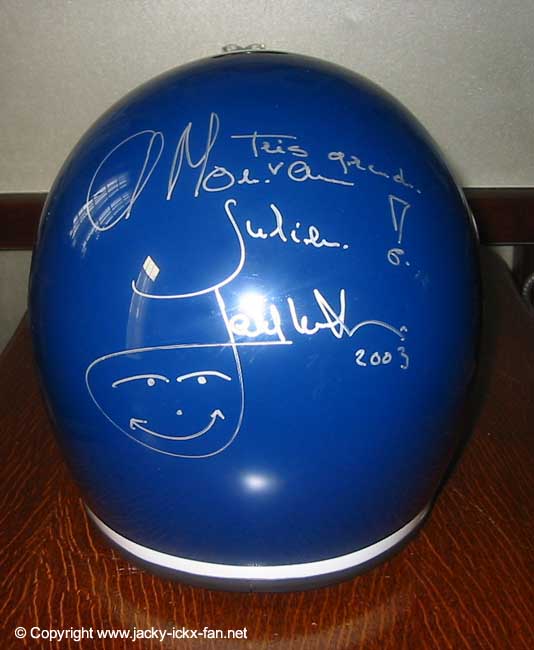 Ce jour-là, à l’heure convenue, nous avons déjeuné ensemble et après le repas, c’est avec plaisir que Jacky apposa sa signature sur le casque. Non pas un simple autographe… mais bien une dédicace dont je ne suis pas peu fier : « A mon très grand ami Julien!« . Une phrase qui signifie beaucoup pour moi. Voilà donc comment cette réplique est devenue originale et unique : par la main même de Jacky Ickx.
