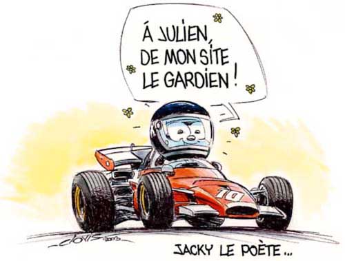 Tribute to Jacky Ickx TRIBUTE TO ARTISTS Accueil » Multimedia » Auto arts This section is dedicated to the artists who have created paintings, drawings, comics, humorous drawings and other art objects representing Jacky Ickx. Yvon Amiel Clovis Benoit Deliège Guillaume Lopez Marc Ostermann Daniel Picot Michael Turner Nicolas Watts Other artists Illustrated little Jacky
