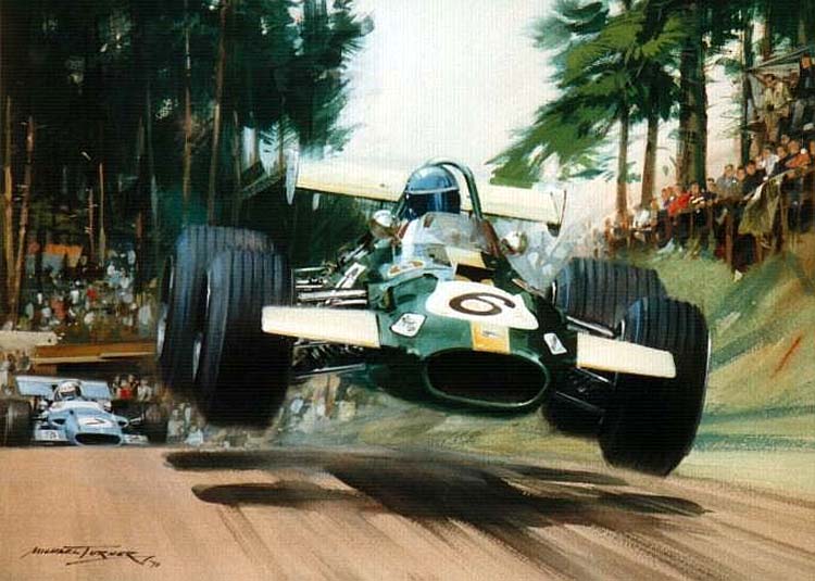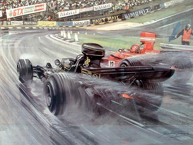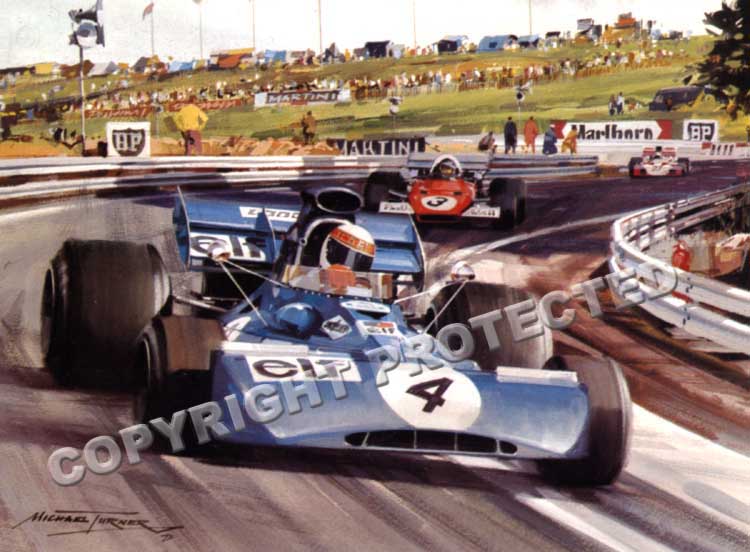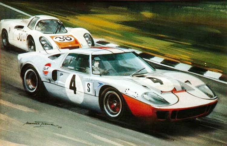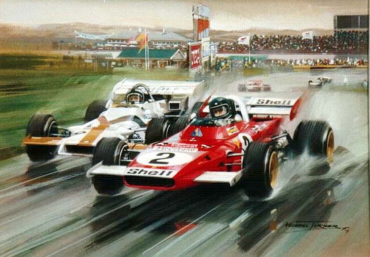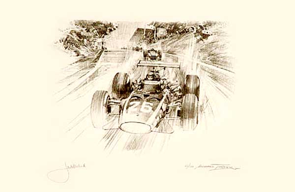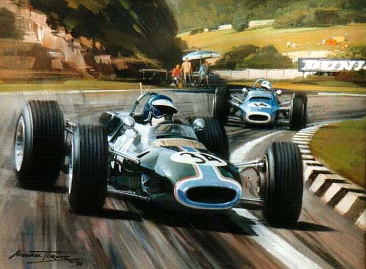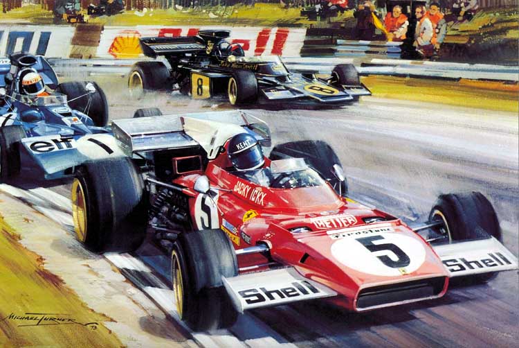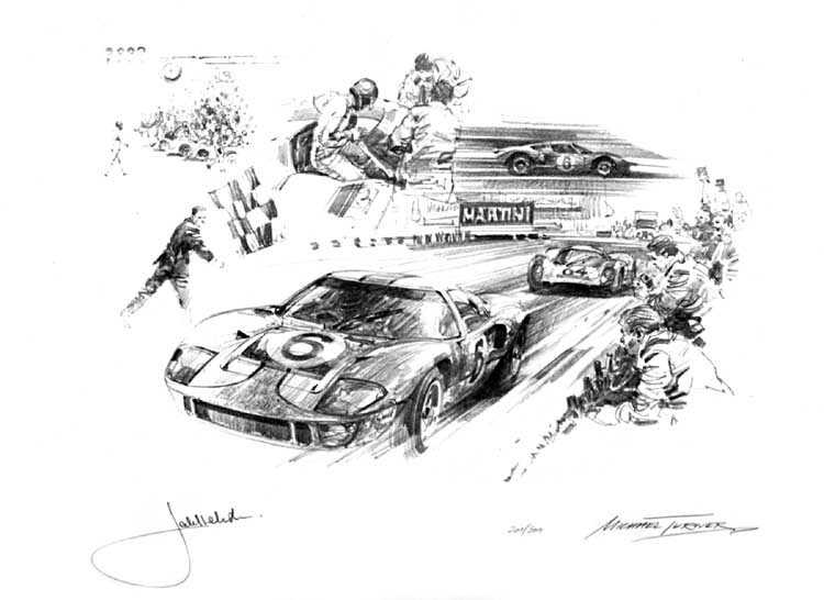 Michael Turner was born in Harrow, Middlesex, in 1934. Raised in the suburbs of London during the Second World War, he was inspired by the exploits of the R.A.F. and developed a first talent for aircraft identification, drawing planes in his notebooks to the great displeasure of his teachers. This enthusiasm for aviation finds a parallel passion in the thrill of motor racing after a vacation on the Isle of Man in 1947 where, by chance, he attends the first post-war race: the British Empire Trophy Race. From that moment on, with the indulgence of his parents, until he is old enough to drive, Michael attends as many motor racing events as possible, including the very first meetings at Silverstone and Goodwood, as well as Jersey car races. His education finished, Michael spent a year at the school of fine arts, followed by two years of military service. Three years in advertising studios in London will provide him with solid experience and in 1957 he becomes a freelancer. He travels the main circuits of the world to satisfy his need for authenticity and continues to go to several Grand Prix every year. He was an honorary companion of the Guild of Automotive Artists. So far, Michael has published six books of his paintings – featuring: the Royal Air Force Airplanes, Formula One, Luftwaffe Airplanes, Aviation Art, Monaco Grand Prix and Automotive Art. Michael Turner left us in December 2025. He was 91 years old.  Jacky Ickx and Michael Turner |