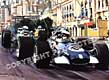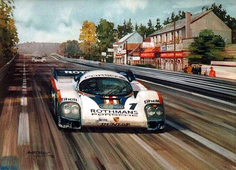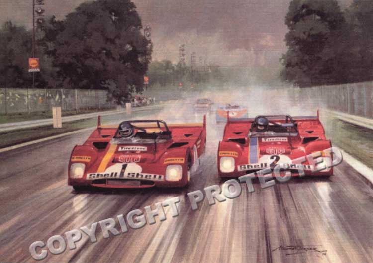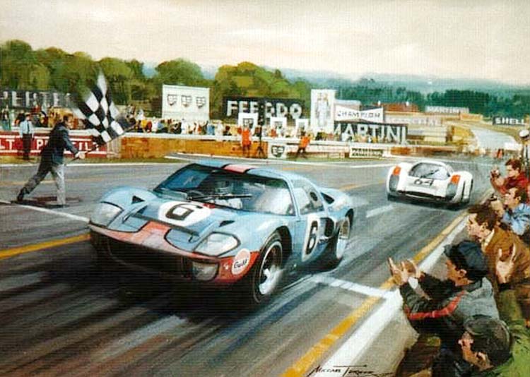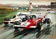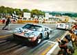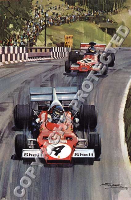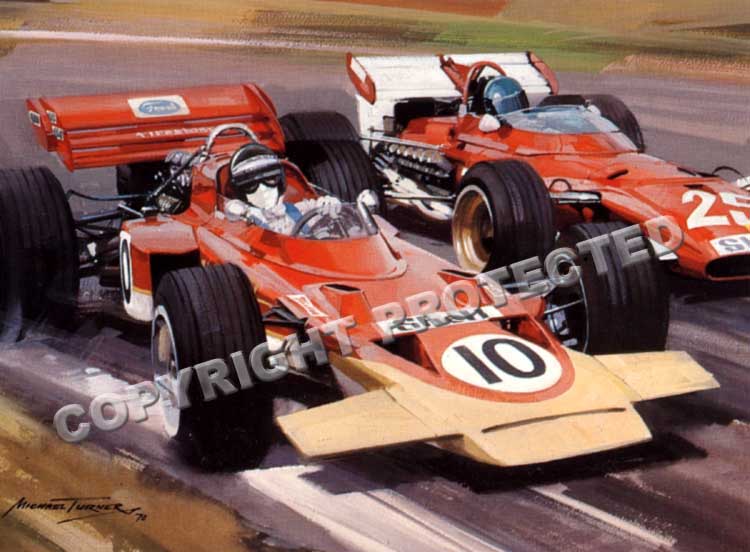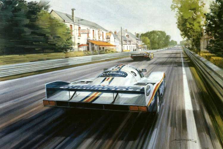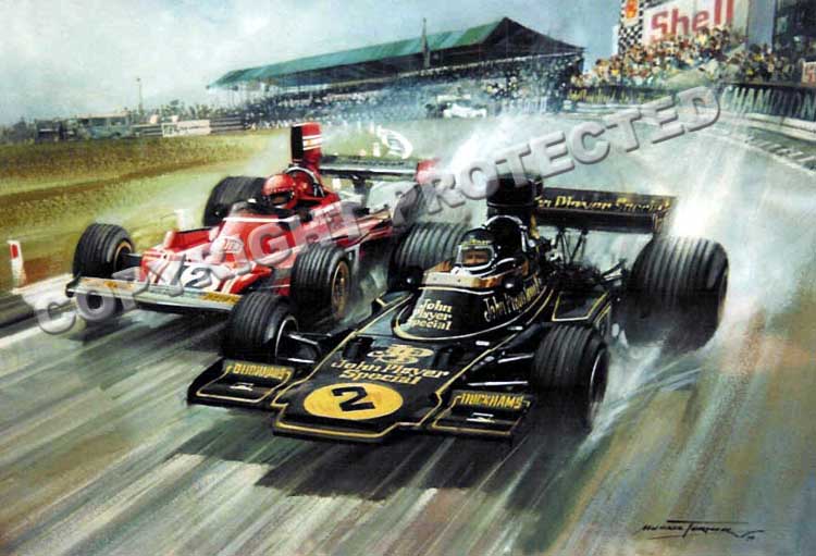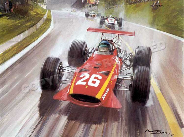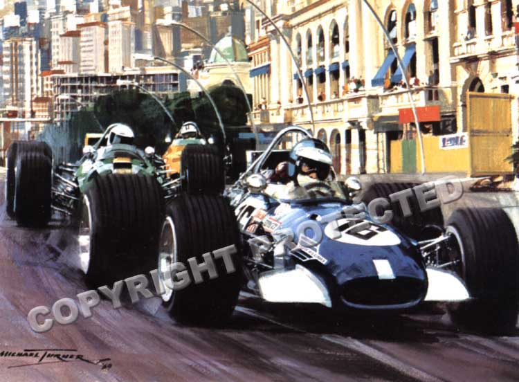 Michael Turner was born in Harrow, Middlesex, in 1934. Raised in the suburbs of London during the Second World War, he was inspired by the exploits of the R.A.F. and developed a first talent for aircraft identification, drawing planes in his notebooks to the great displeasure of his teachers. This enthusiasm for aviation finds a parallel passion in the thrill of motor racing after a vacation on the Isle of Man in 1947 where, by chance, he attends the first post-war race: the British Empire Trophy Race. From that moment on, with the indulgence of his parents, until he is old enough to drive, Michael attends as many motor racing events as possible, including the very first meetings at Silverstone and Goodwood, as well as Jersey car races. His education finished, Michael spent a year at the school of fine arts, followed by two years of military service. Three years in advertising studios in London will provide him with solid experience and in 1957 he becomes a freelancer. He travels the main circuits of the world to satisfy his need for authenticity and continues to go to several Grand Prix every year. He was an honorary companion of the Guild of Automotive Artists. So far, Michael has published six books of his paintings – featuring: the Royal Air Force Airplanes, Formula One, Luftwaffe Airplanes, Aviation Art, Monaco Grand Prix and Automotive Art. Michael Turner left us in December 2025. He was 91 years old.  Jacky Ickx and Michael Turner |